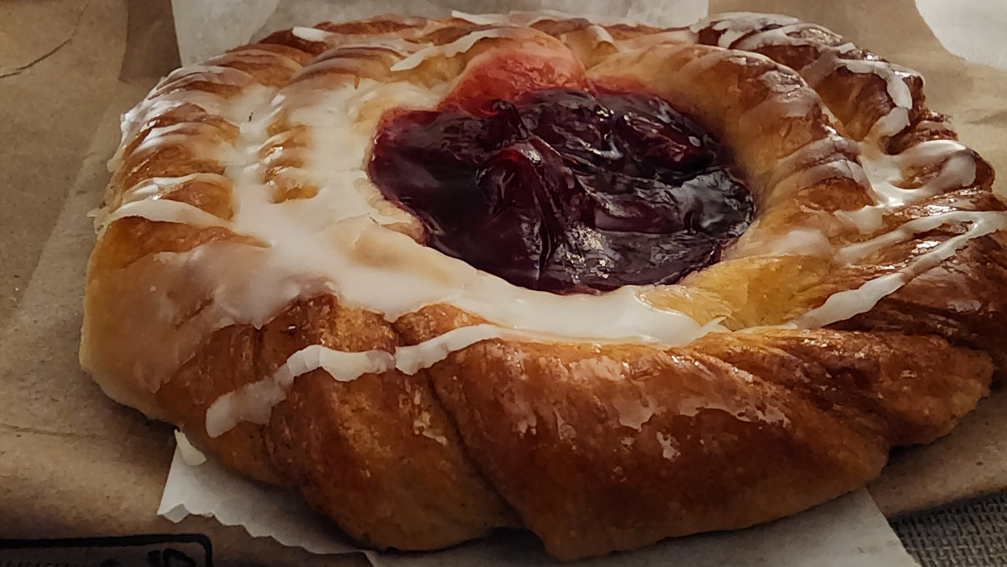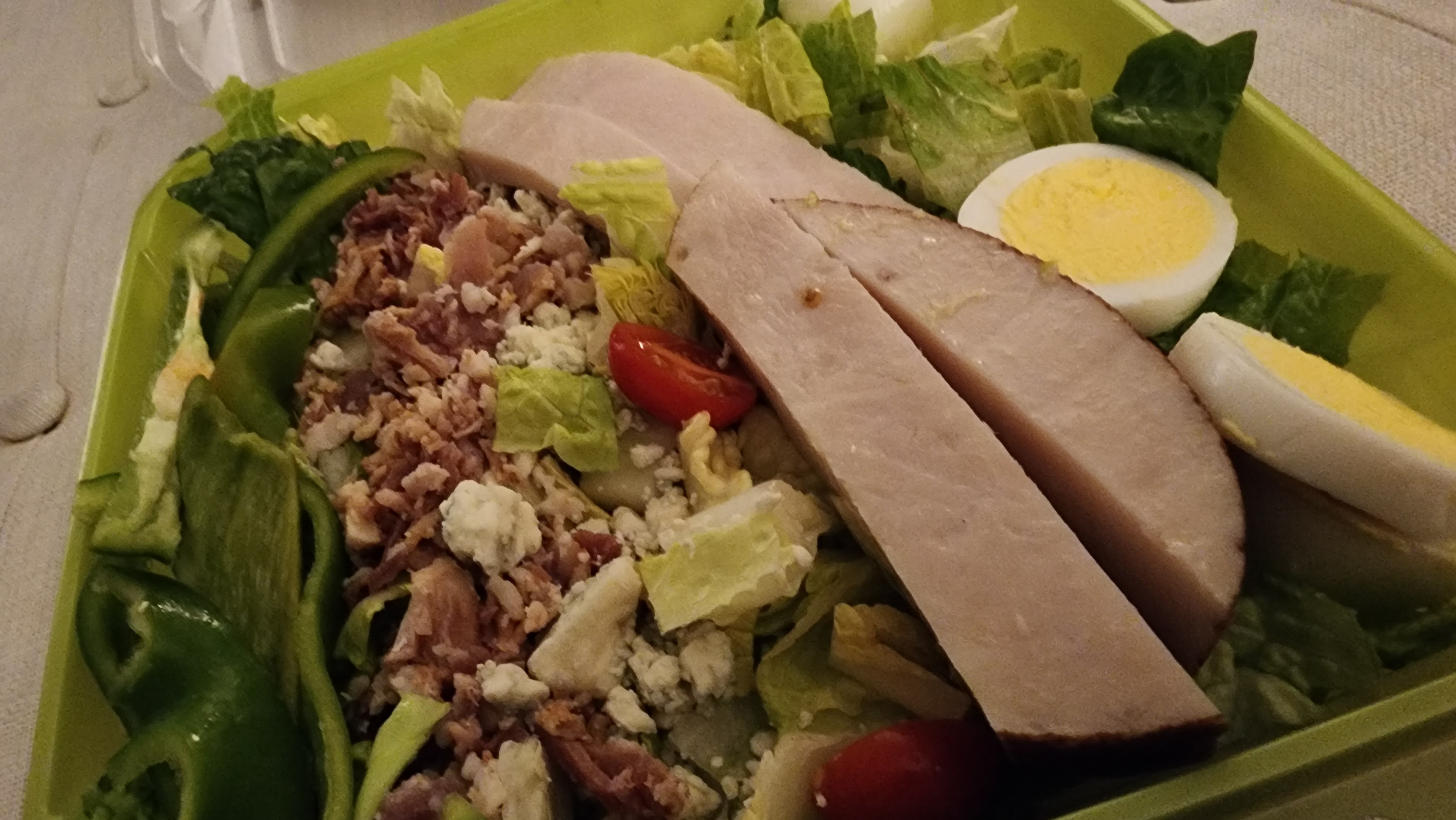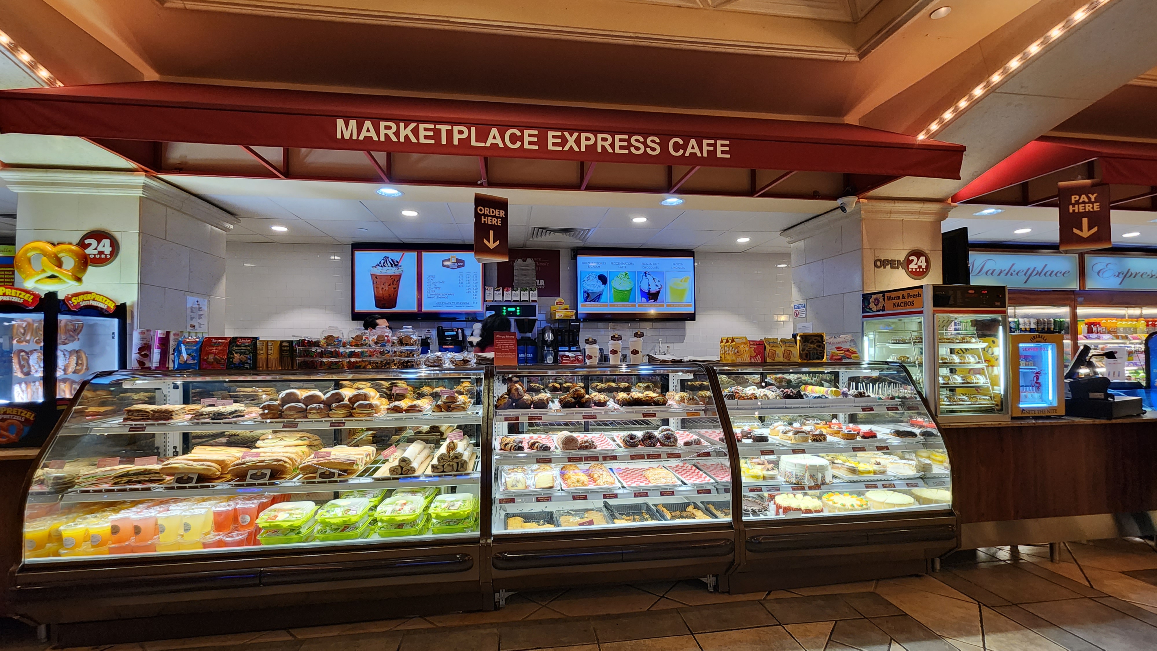 Late Night Snack: A quick visit to the Marketplace Express Cafe led us to a refreshing salad and a delectable cherry danish.