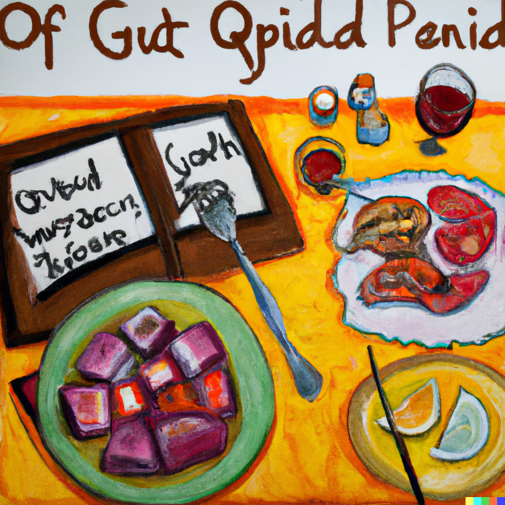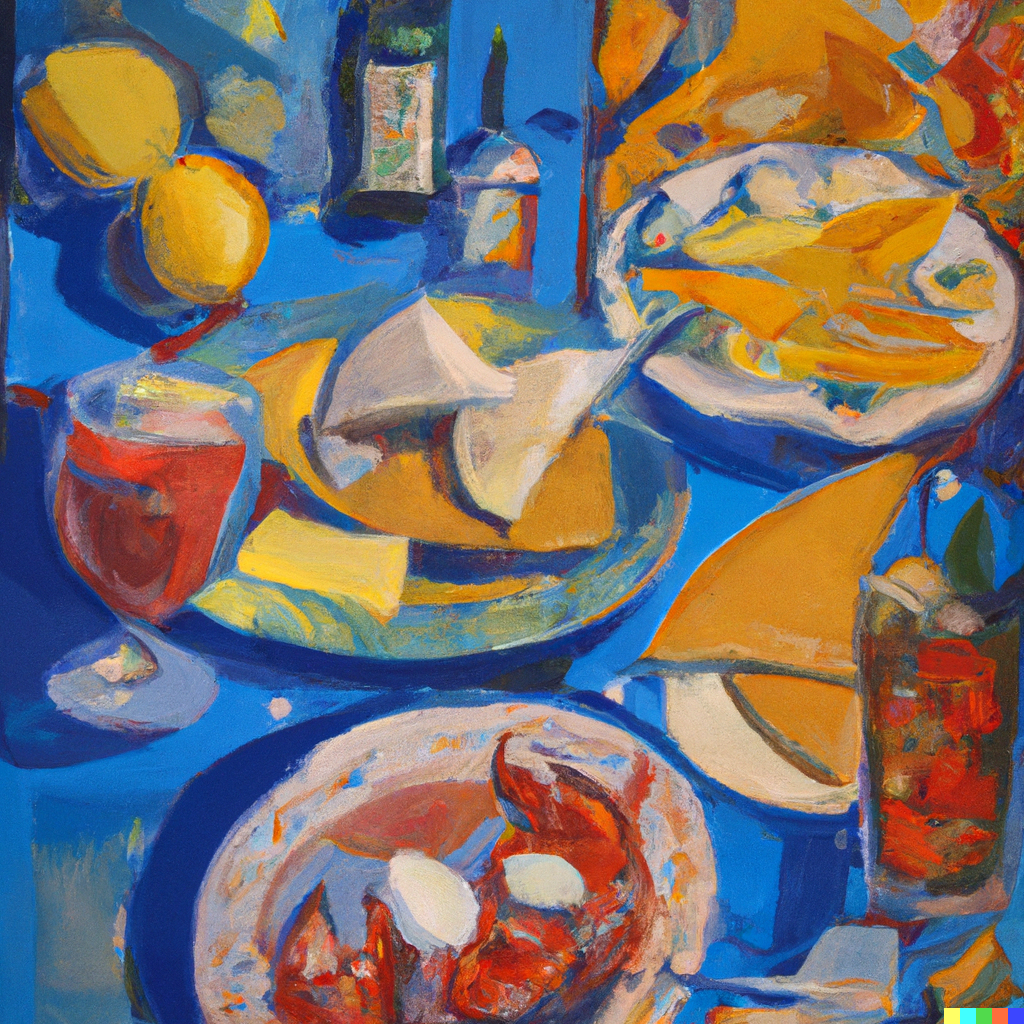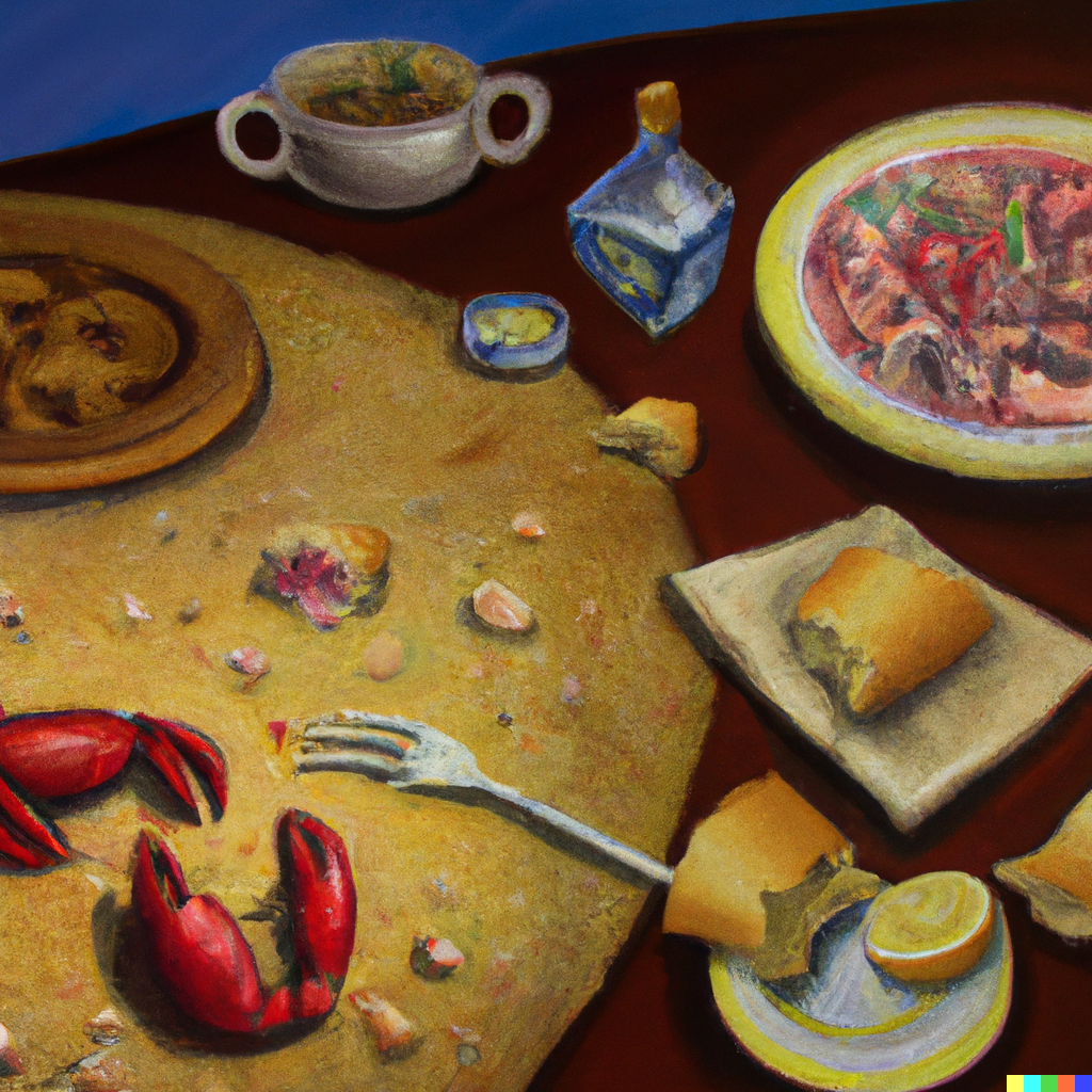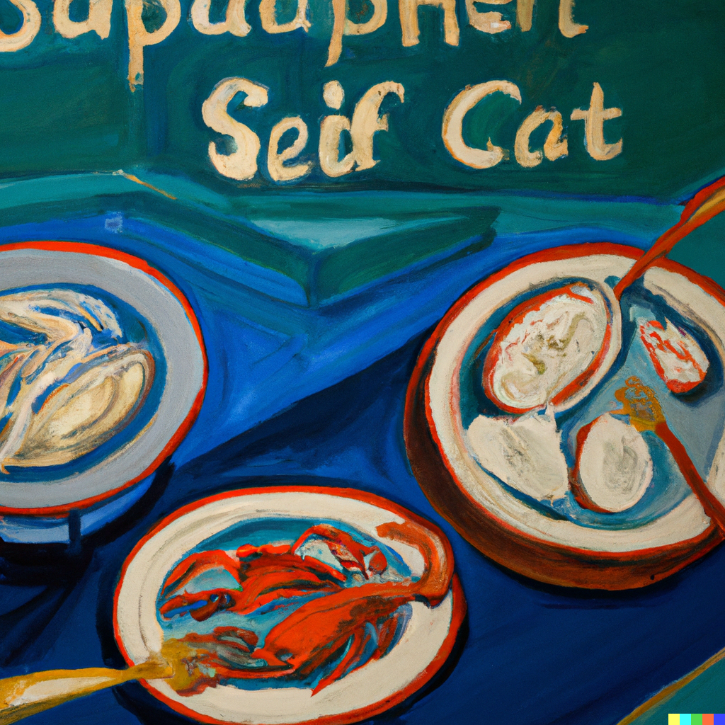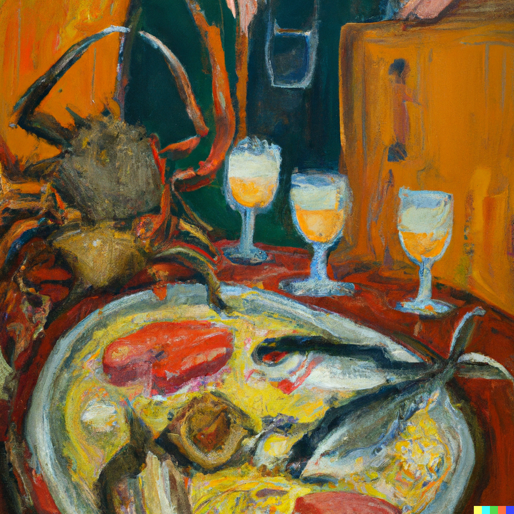 an abstract oil painting of ChatGPT making up non existent content into a seafood dinner with sentence structure