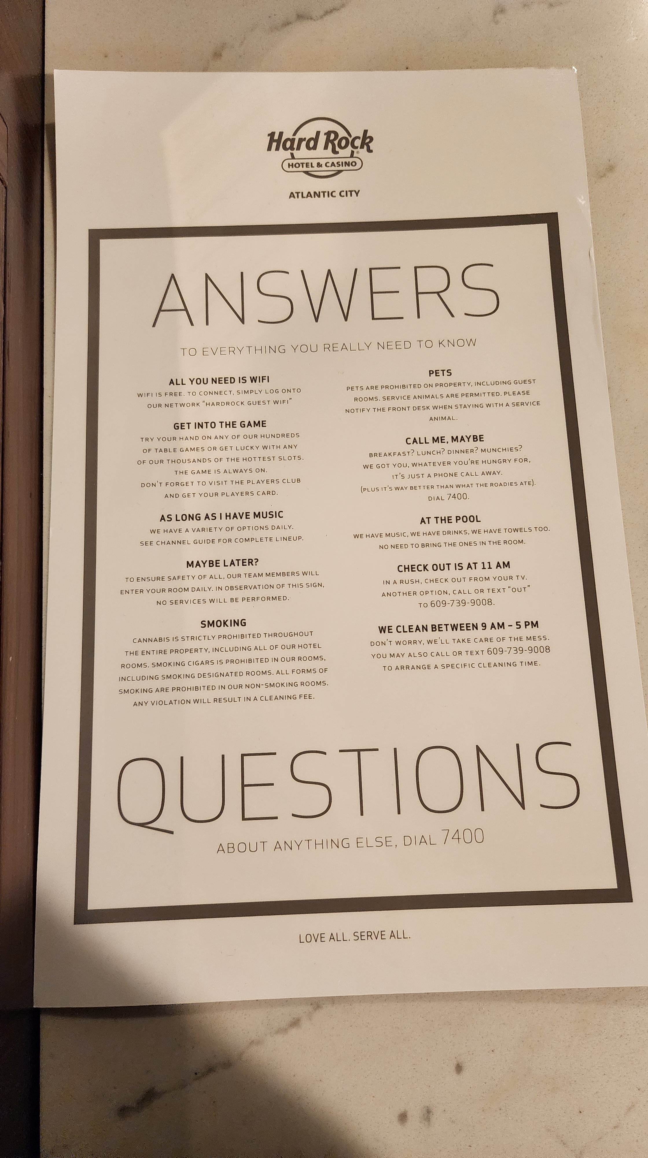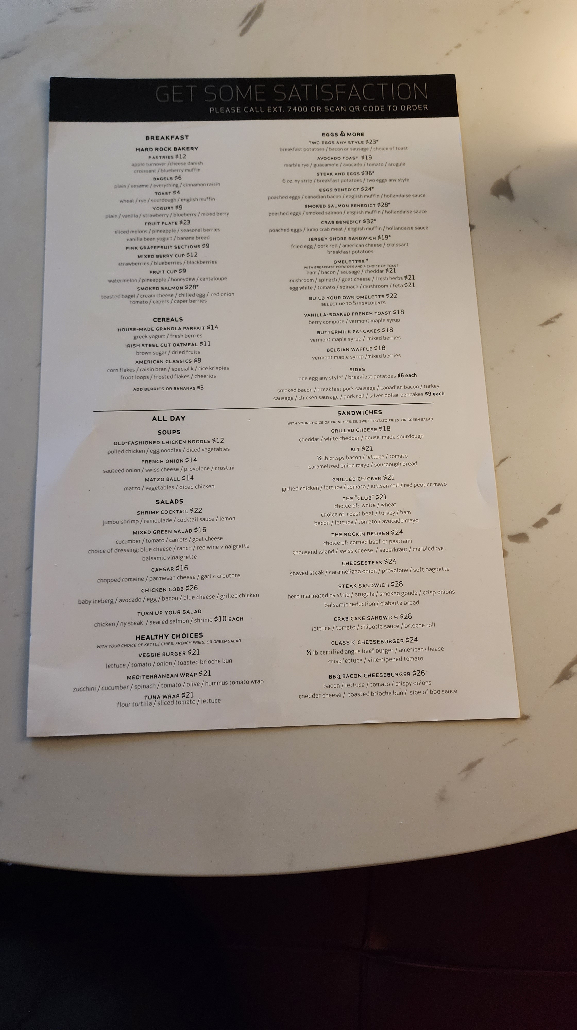 While exploring the amenities Hard Rock Atlantic City had to offer, we were pleasantly surprised to discover their extensive room service menu. Available all week long, from breakfast to late-night snacks, it presented an enticing option we hadn’t enjoyed at many other places. Though we didn’t personally take advantage of this service during our stay, knowing it’s available for our future visits adds an extra layer of anticipated comfort. This option stands in stark contrast to our experiences at Tropicana. Their in-room dining, while seemingly promising via the Caesars Eats program, was riddled with limitations and inconsistencies, especially noticeable during mid-week stays. While some might overlook such amenities, for us, it speaks volumes about a hotel’s commitment to guest comfort. The mere option of room service, done right, adds a luxurious touch we now look forward to experiencing during our subsequent visits to Hard Rock.