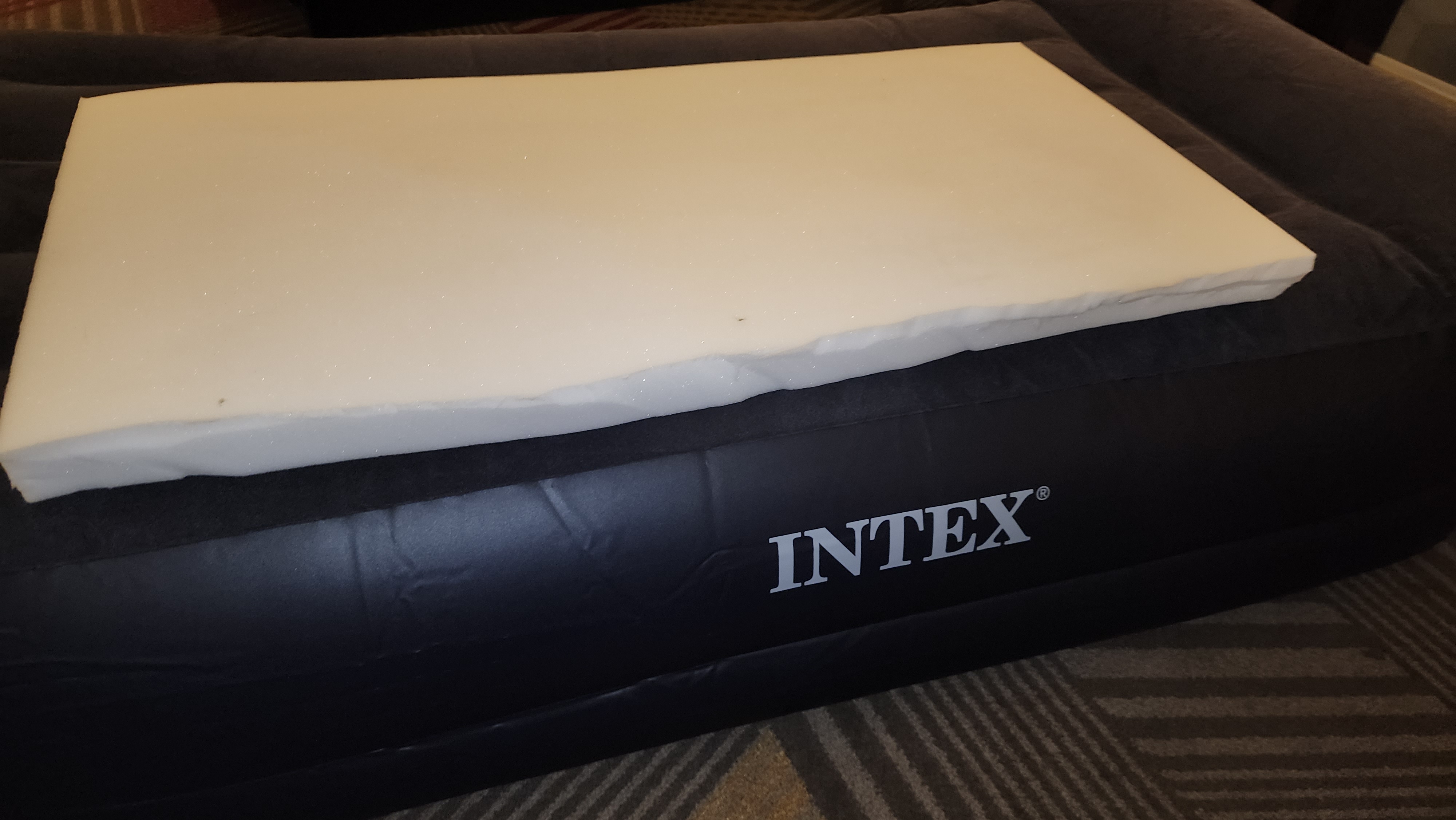 I intended for the air mattress to serve as a mobile ottoman, with the foam pad providing potential extra height if needed. I tailored the foam pad to fit snugly in a suitcase, making room for other comfort items we prefer to carry on our travels.