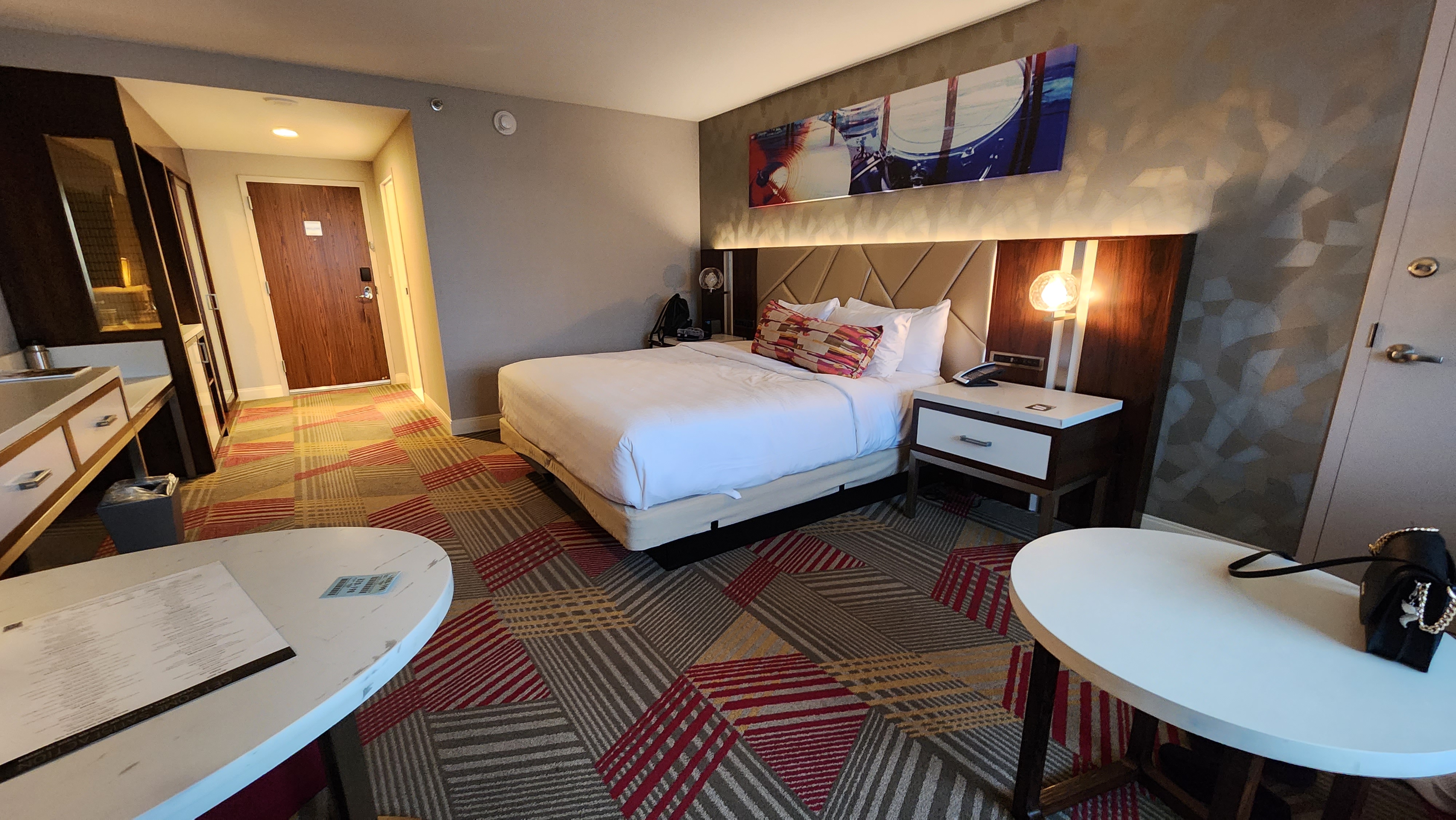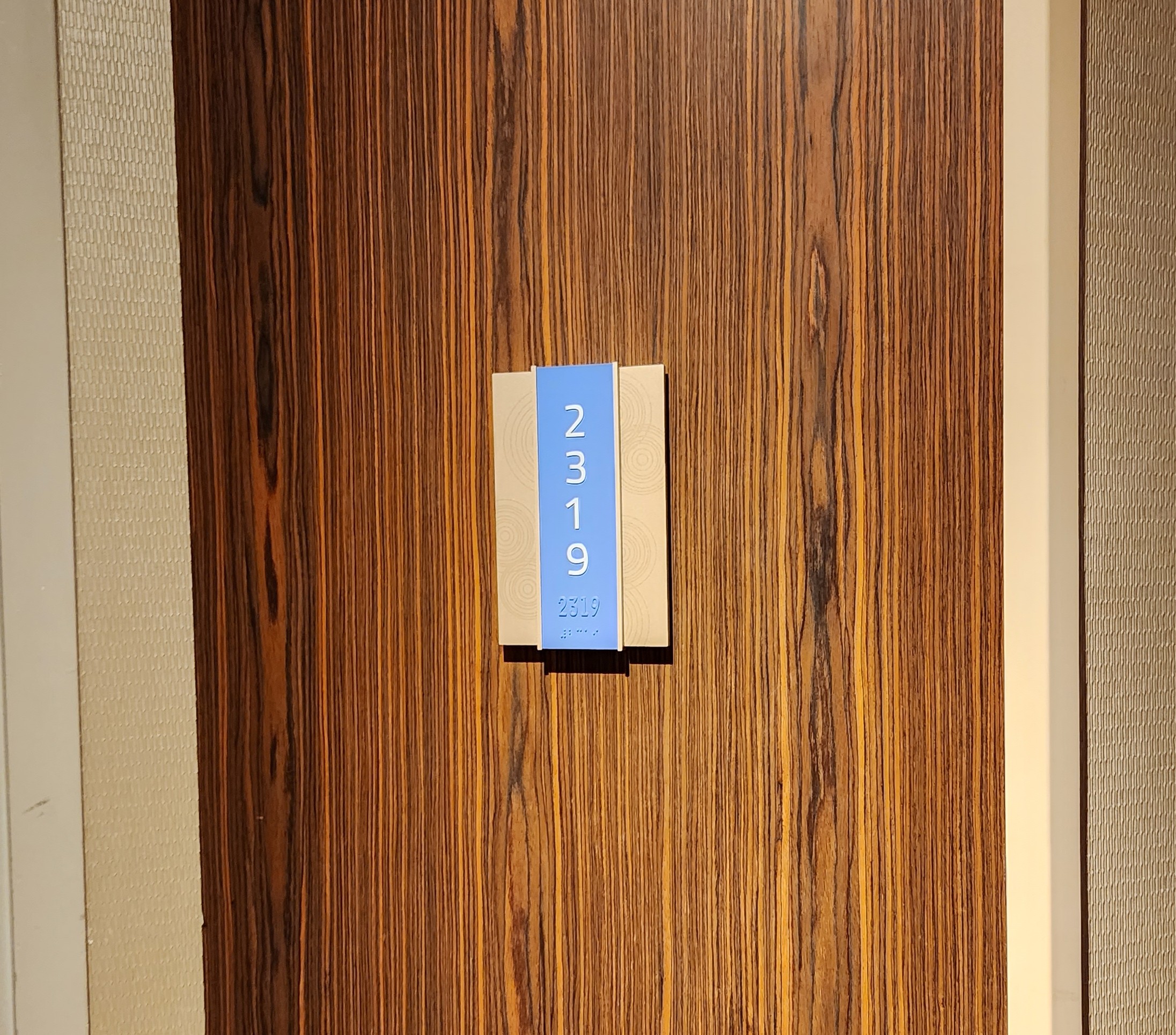This trip, our familiarity with Hard Rock’s layout made navigating much more effortless. The valet service was swift, and being in the Rock Royalty priority line, which was notably empty compared to the bustling regular check-in queue, was a perk we pondered about for future visits, especially with our Rock Royalty status set to expire at year’s end. We opted for a room with a walk-in shower this time, a change from our previous stay. Heading to our room, the door number, 2319, unexpectedly brought back delightful memories of our son’s toddler years, reminiscent of a classic scene from Monsters Inc.