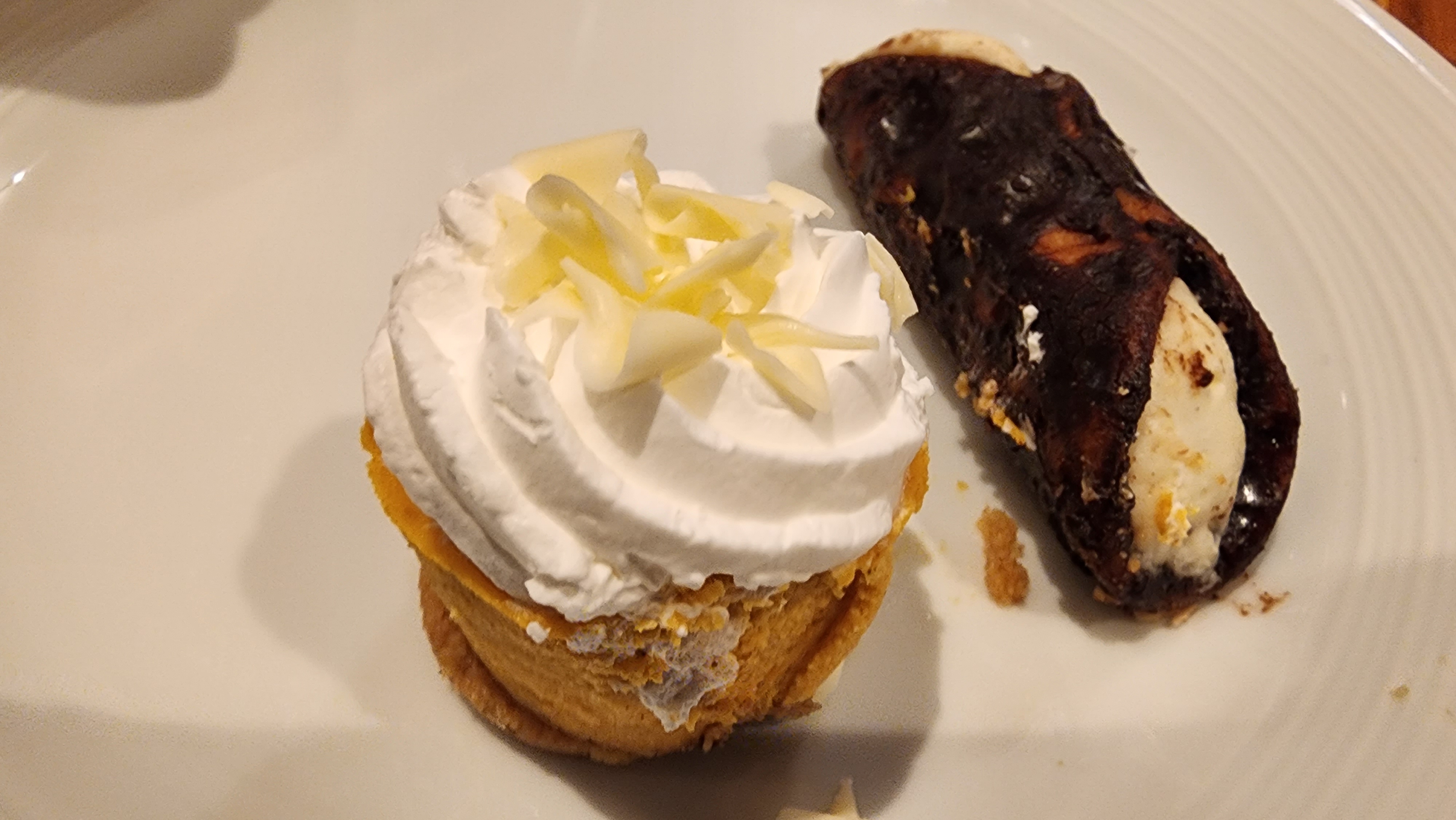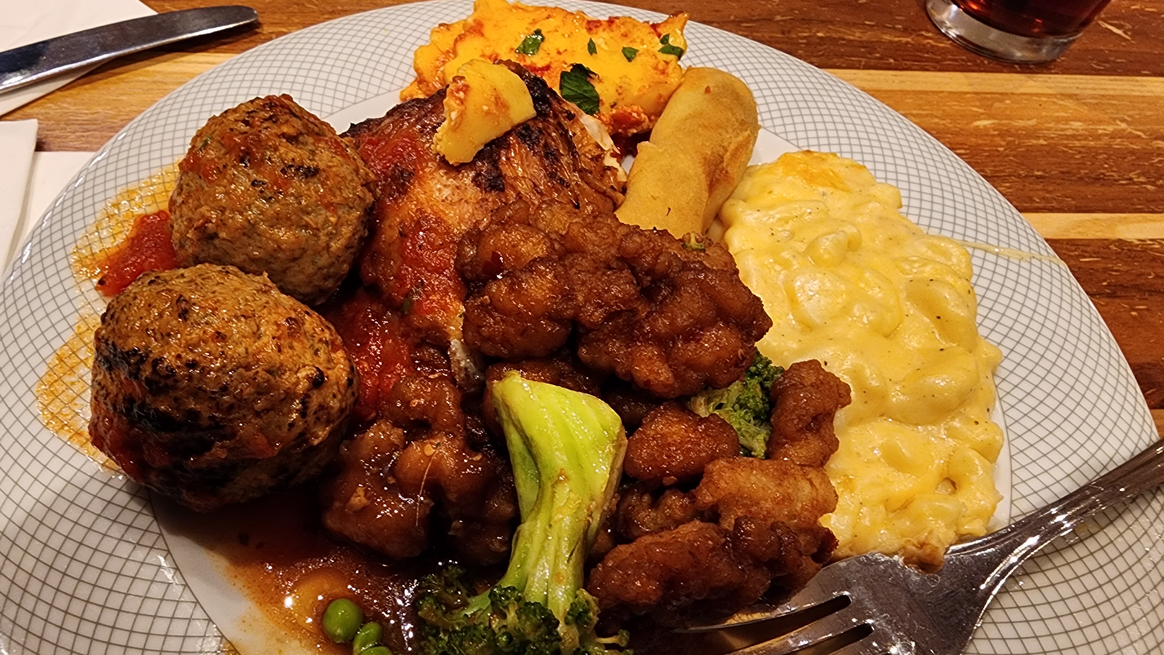 I, on the other hand, embarked on a more eclectic culinary journey, selecting an assorted array of items from the buffet. My plate was a colorful mosaic featuring the distinctively spicy General Tso’s chicken (seems to be a favored dish on this trip), the sweet and crunchy coconut shrimp, lightly battered fried calamari, creamy and savory crab rangoon, delectable mini crab cakes, golden-fried cod, heart-warming mac & cheese, and robust slices of prime rib—truly, the variety was vast. One might say it was a bounteous spread—AND INDEED IT WAS. Despite the sheer volume, I couldn’t resist capping off this feast with a petite but rich pumpkin cheesecake and a chocolate cannoli, both of which served as my sweetly decadent epilogue.