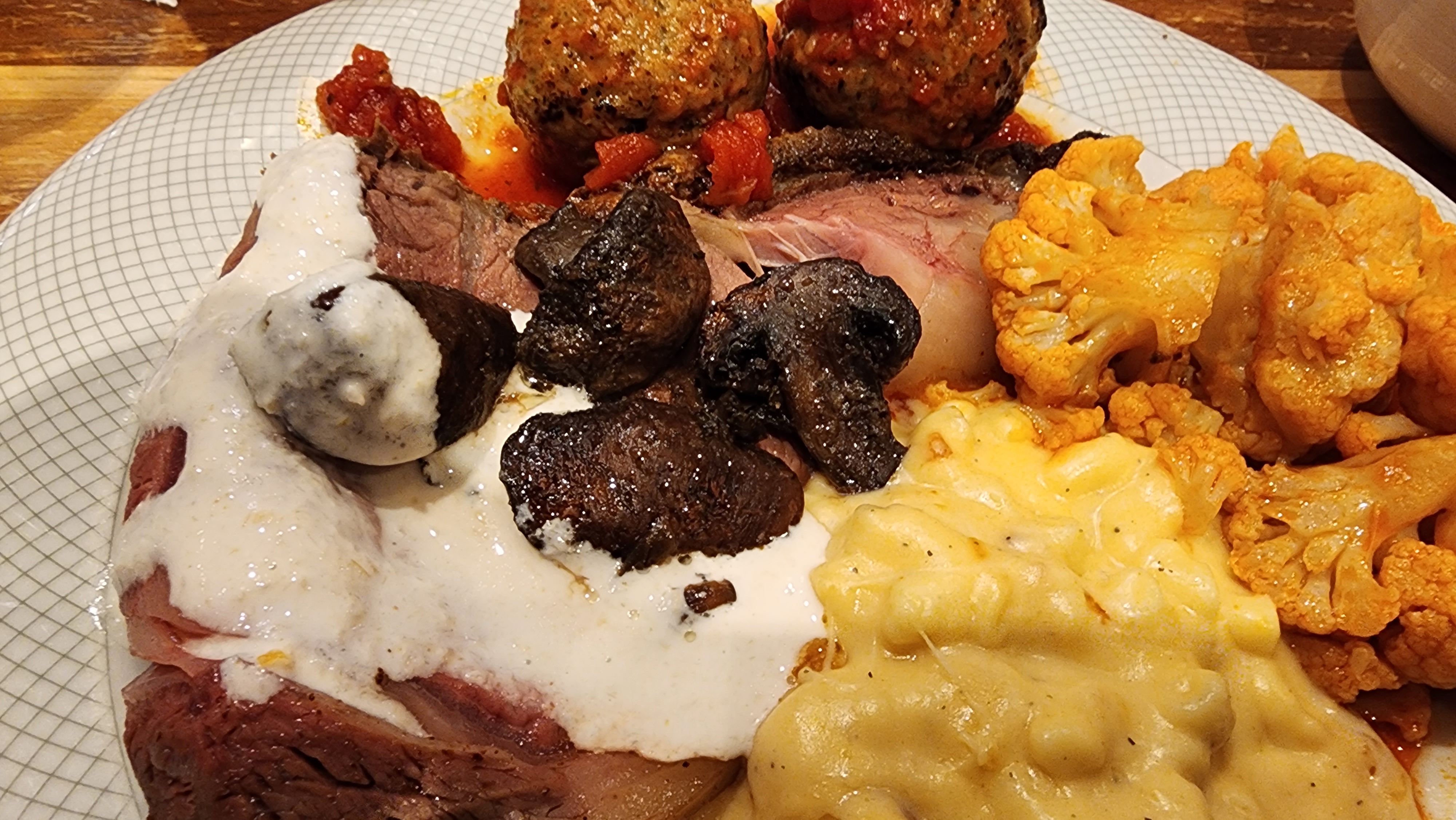 The Prime Rib at the carving station was a standout, with the chef on duty expertly slicing through the tender, juicy meat that was cooked to a perfect medium-rare. The Spicy Cauliflower provided a delightful contrast, with its crunchy texture and a zesty flavor profile that kept my taste buds dancing throughout the meal.