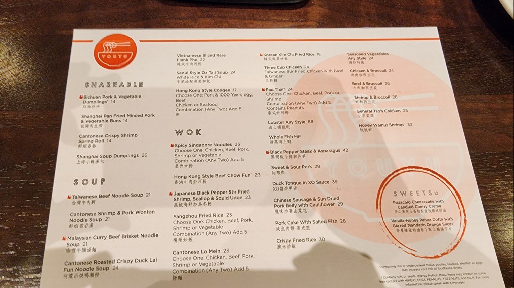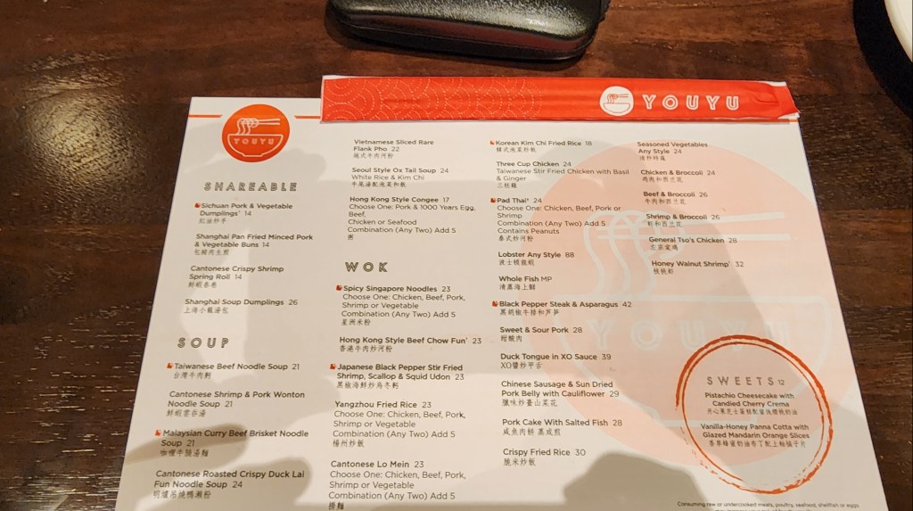 For day two, we decided to check out YouYu noodle bar. W e were ready to savor what we hoped would be a memorable early dinner. Seated at our table with intricate decor and the soft hum of conversation around us, we eagerly scanned the menu.