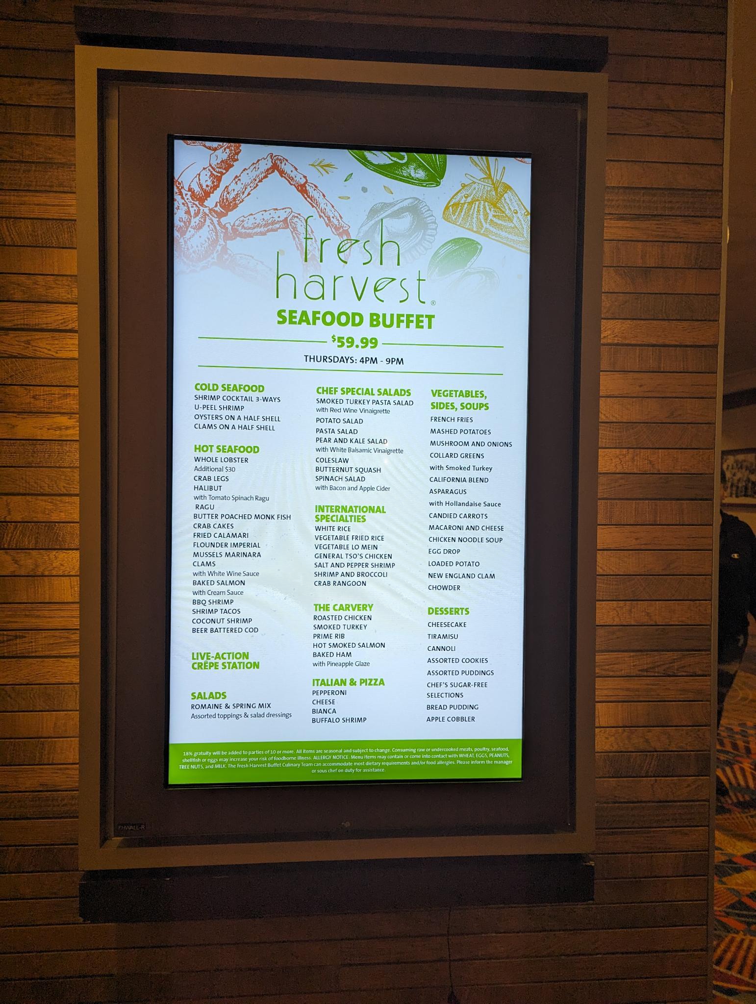 On our third and final day at Hard Rock, we found ourselves in a delightful quandary, torn between spending our time in the comfort of the Legends Lounge and indulging once more in the gustatory pleasures of the Fresh Harvest Buffet. My wife was particularly taken by the seductive offer of all-you-can-eat crab legs that beckon seafood lovers every Thursday at the Fresh Harvest. As a result, it became a straightforward decision for her; she was resolute in her focus, mainly feasting on the crab legs.